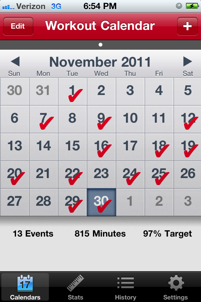 I started keeping this calendar back in May when I started training for my first half marathon (it’s a free app called Tracker Lite).  I’m a very visual person and like actually seeing the check marks on each date that I’ve gotten in a workout.  I’ve set my “goal” number of minutes I’d like to work out each month and as I enter in my workouts it let’s me know how close I am to reaching my target.