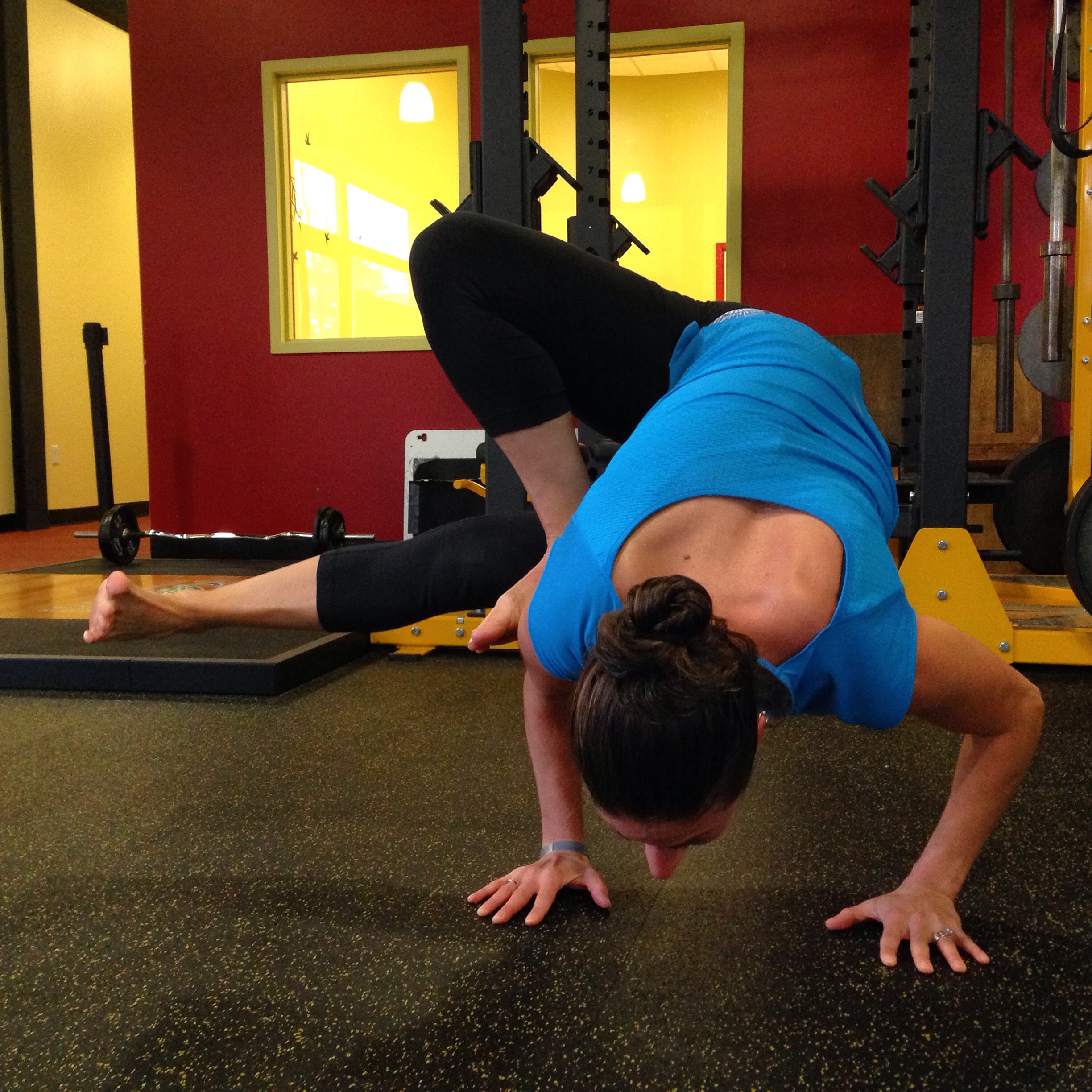 • Haha, well it’s probably easier for me to make a video of getting into it to show you (which I’m happy to do if you want to send me your e-mail address!), but basically I start standing with my right foot crossed over my left knee (sort of the “figure 4” shape), I twist to the left, place my hands on the floor and then bend my elbows back similar to crow pose and then place my right foot on top of my right elbow and lift my left leg!